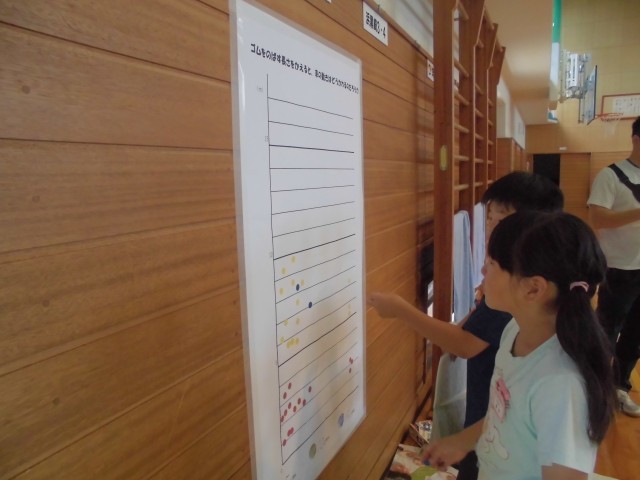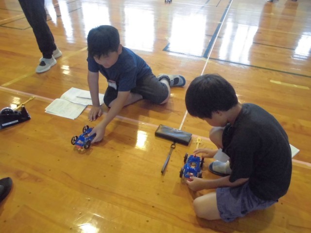 今日は、ゴムを伸ばす長さを変えると車の動きはどう変わるのか、実験をして確かめました。