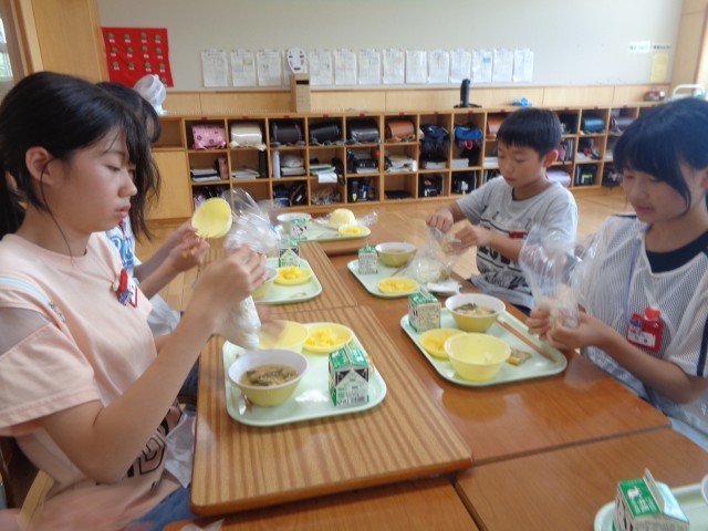 今日の給食は防災給食でした。保存期間が長い食材を使用した、食器を汚さずに食べることができるメニューでした。