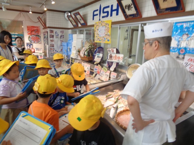 子供たちは、大きな魚やお総菜を見て、「おいしそう」と話していました。