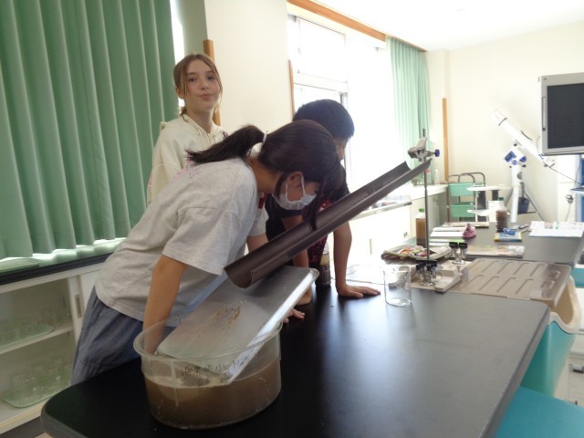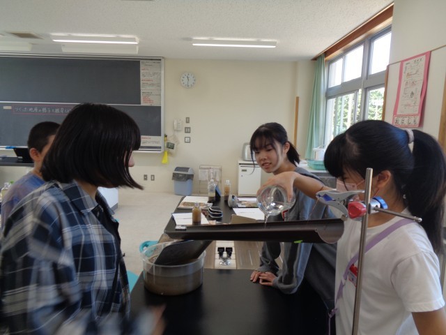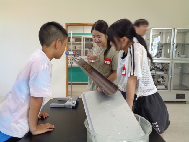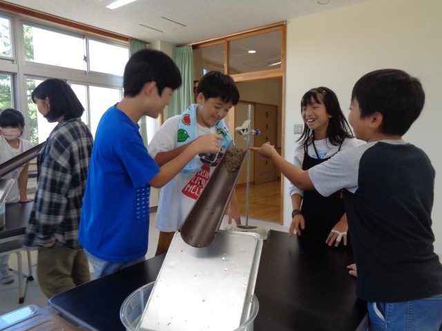 土を水で流し、層ができるかを調べました。また、ペットボトルで作った地層の様子を観察していました。