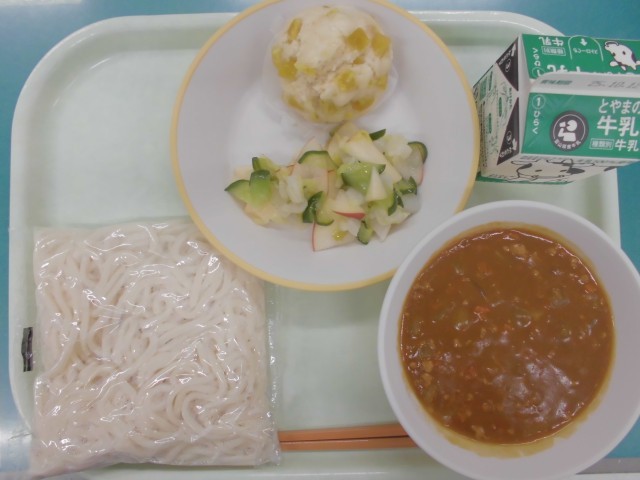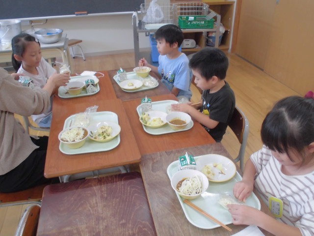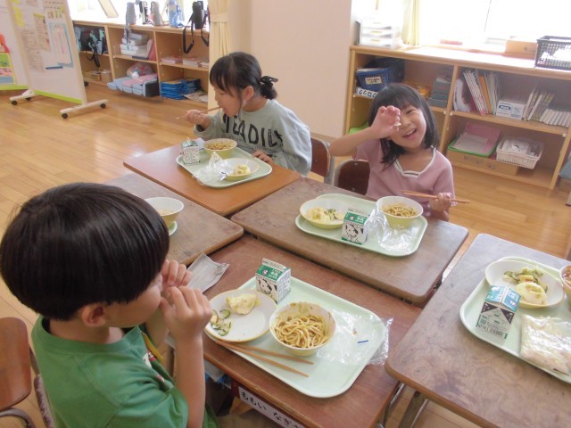 1年生にとっては、入学してから初めてのソフト麺です。ソースが飛ばないよう注意しながら、おいしそうに食べていました。