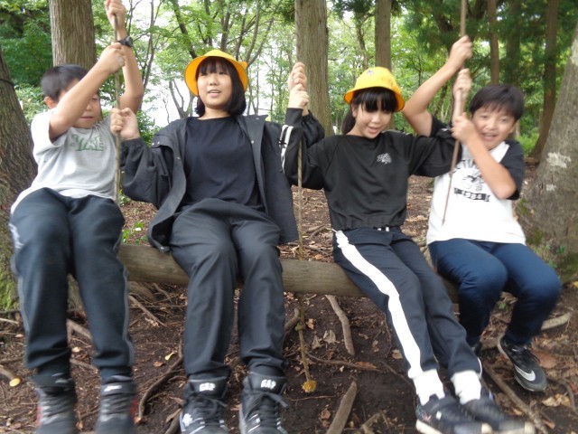 金塊探しの後は、森の宝さがしビンゴを行いました。森の中でお題に合った物を探し、ビンゴを目指しました。森の中に入って周りを注意深く見たり、アスレチックで遊んだりしました。自然とたくさん触れ合うことができました。