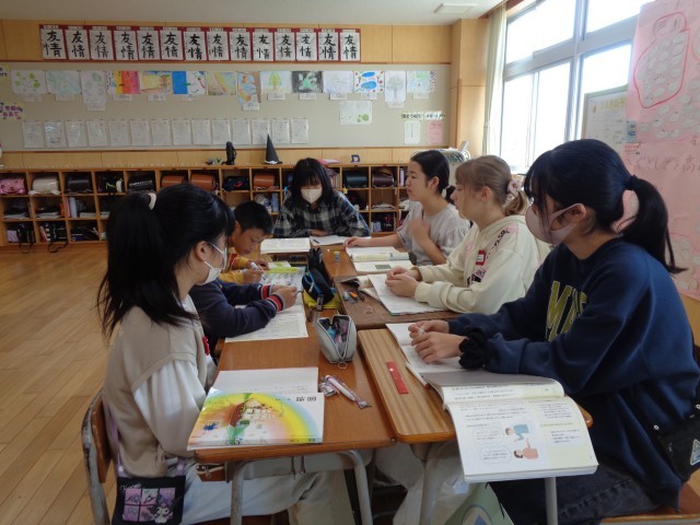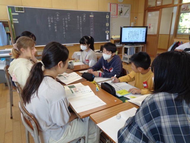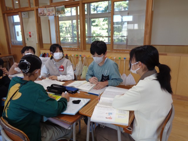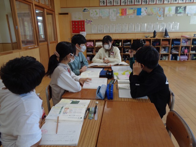 1年生との交流集会でどのような遊びをしたらよいのかを考え、グループで話し合いました。目的や条件から話がそれないように進めました。自分の考えを分かりやすく伝えたり、疑問点を質問したりして積極的に話し合いました。