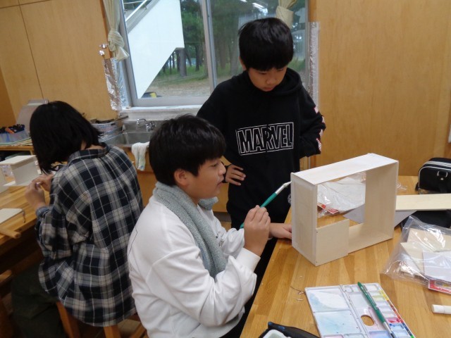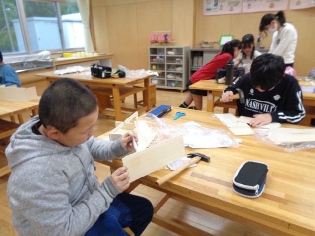 図画工作科では、「一枚の板」の学習を進めています。着色したり組み立てたりして、作業を進めました。