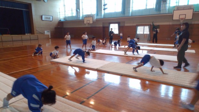 授業のはじめは、怖くて前転ができなかった子も、「腰を上げておへそを見る」というポイントを意識することで、転がることができるようになっていました。また、今まで後転ができなかったけれど、今日のマット教室をきっかけにできるようになった子もいました。