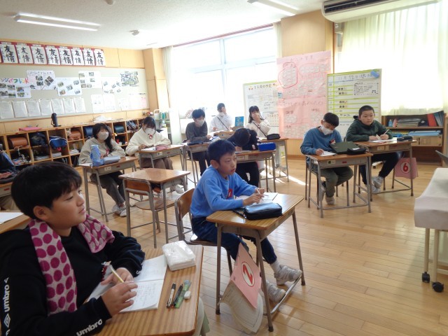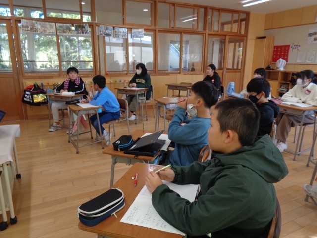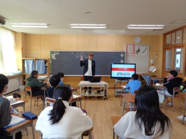 総合的な学習の時間「私の未来プロジェクト」の学習で、アルビス株式会社の人事部の方を講師としてお招きし、お仕事の話を聞きました。自分の好きなことを仕事にできる素晴らしさや、常に目標を持ち続けることの大切さを教えていただきました。