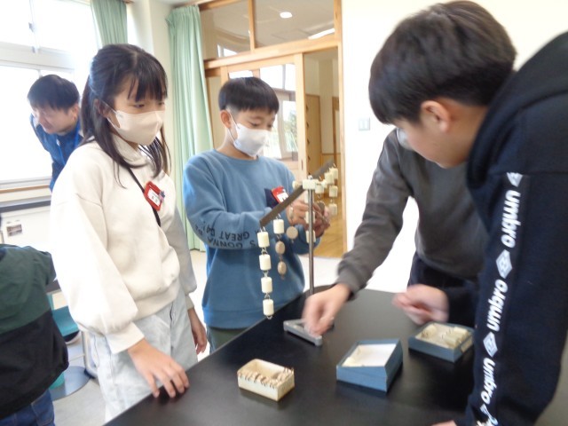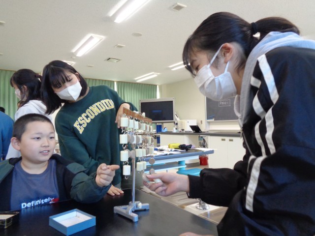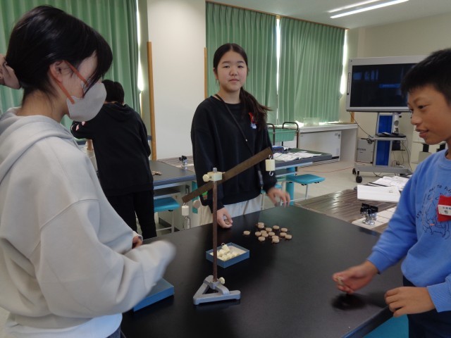 理科では、実験用てこを使って、重りがつり合うことを試していました。