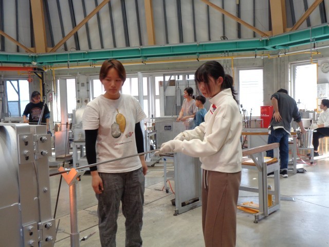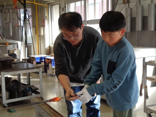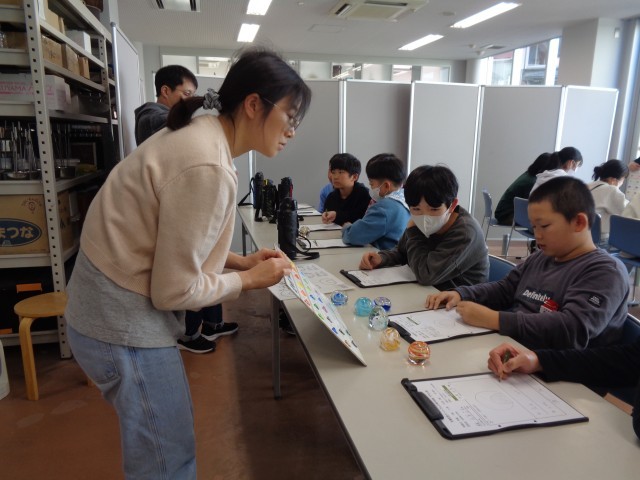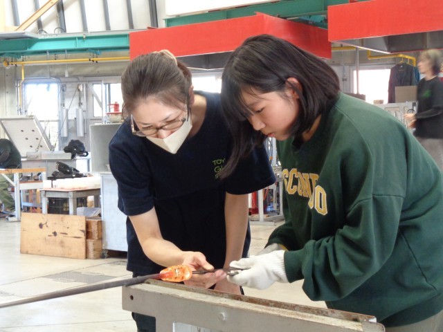 午後からは富山ガラス工房で、ペーパーウエイトをつくりました。3種類から形を選び、デザインや色を考えました。そして、ガラス作家の方と一緒に色を付けたり形を整えたりしました。仕上がりが楽しみです。