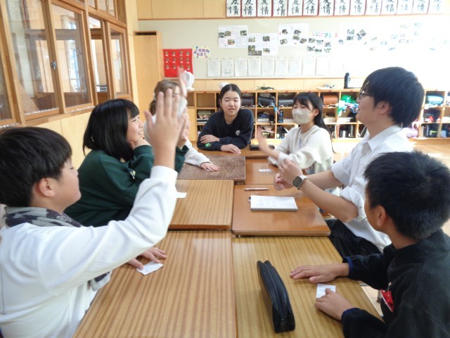 学級活動では、12月の集会の案を出し合いました。最後はゲームをして、駆け引きを楽しみました。