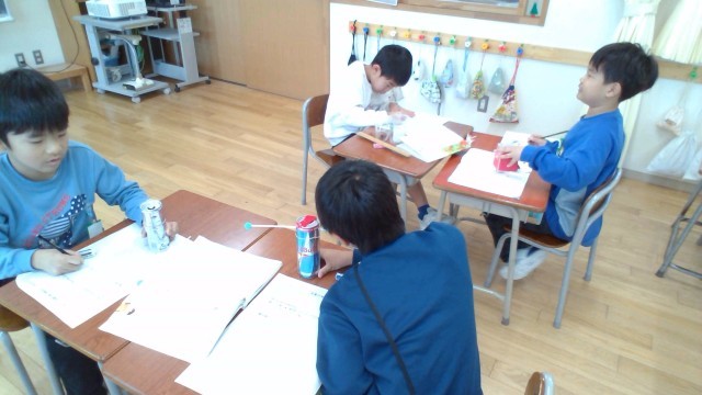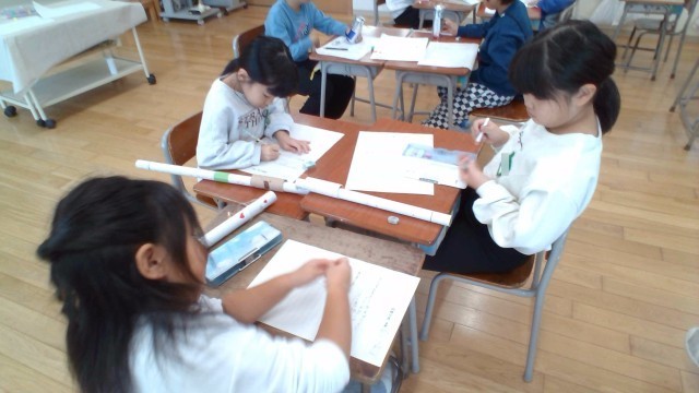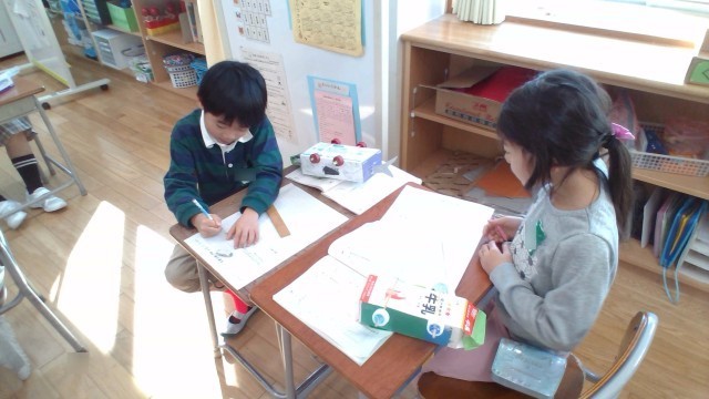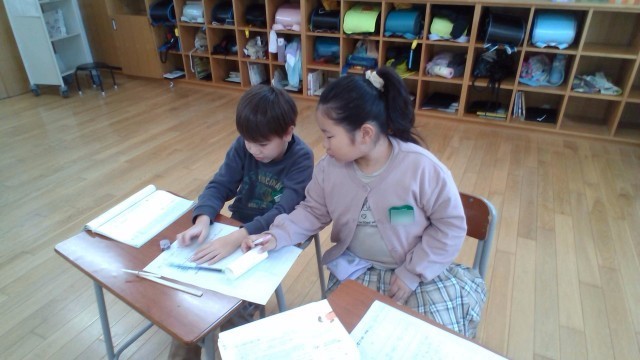 その後、生活科で自分が作ったおもちゃの作り方の説明文を書きました。同じおもちゃを作っている友達同士で相談しながら書きました。「この書き方で、うまく伝わるかな?」と、読み手を意識しながら書こうとする姿が見られました。