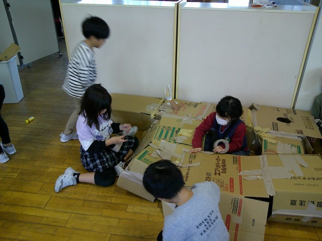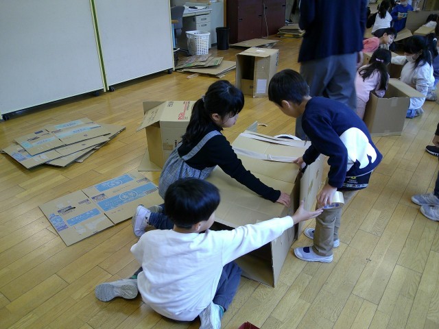2年生は、図画工作科で「だんボールの中に入ってみたら」という学習をしました。段ボールをいくつもつないでトンネルにしたり、大きな家を作ったりと、大広田小学校の友達と話し合いながら活動していました。