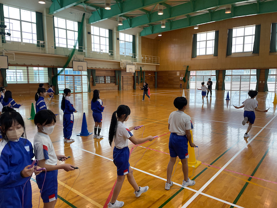 体育科では、ボール運びリレーやなわとびリレーを行い、声援を送り合っていました。