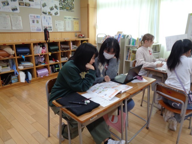 「まかせてね今日の食事」の学習の様子です。一食分の献立を考えた後、班に分かれて一品を作る計画を立てました。人数や好みに応じて計画を立てていました。