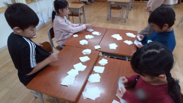 子どもたちは、500枚くらいかな?と予想を立てていましたが、10のまとまりをつくりながら数えていくと、1000枚以上ありました。