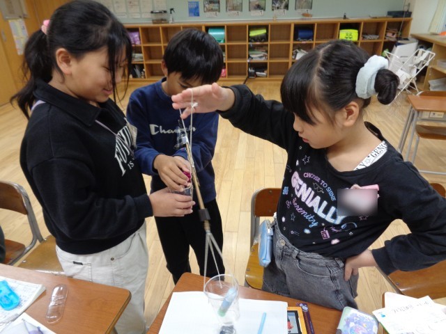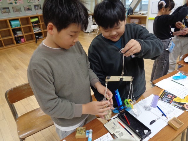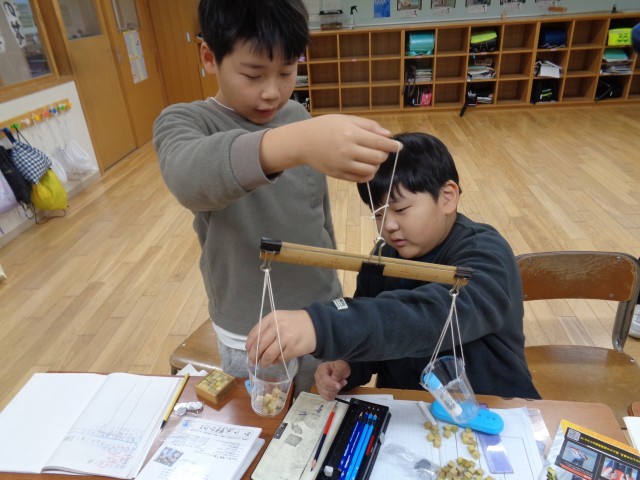 てんびんにコンパスや消しゴムをのせて、つみ木や1円玉を使って単位量あたりの重さをはかりました。