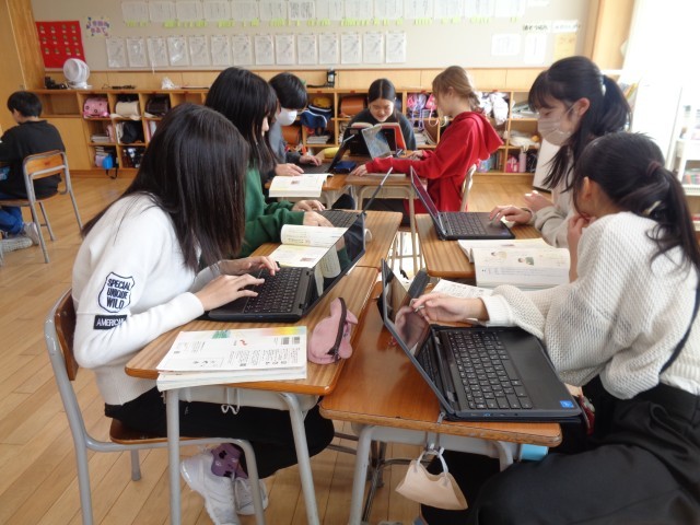 国語科では、「おすすめパンフレットを作ろう」の学習を進めています。グループに分かれて、何をおすすめしたいのかを決め、パンフレットにまとめています。
