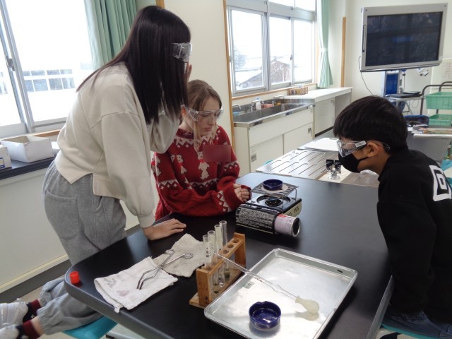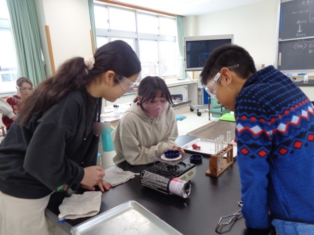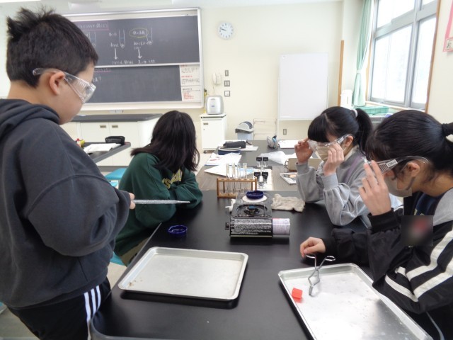 理科では、塩酸に溶けた鉄やアルミニウムを蒸発させるとどうなるのかを調べました。安全に気を付けて実験しました。