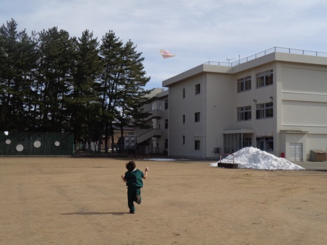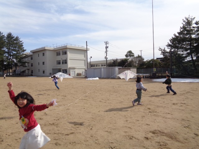 風の力を感じながら一生懸命に走り、凧あげを楽しみました。
