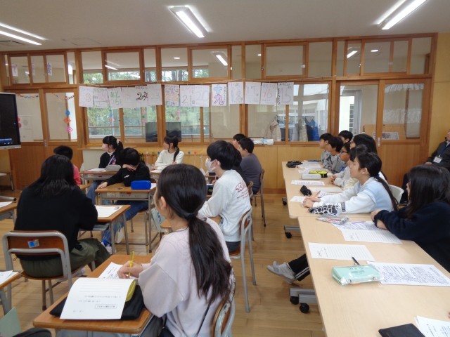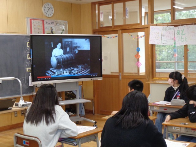 ゲストティーチャーをお招きし、富山大空襲の話をしていただきました。焼夷弾の威力や被害の規模など、写真や動画で分かりやすく教えていただきました。また、戦地から送られた実際の葉書を見せていただき、その時に生きた人々の思いに触れることができました。歴史で様々な争いを学んできた6年生ですが、富山で起こった出来事に心を寄せ、今ある幸せを大切にしたいという思いを強めました。