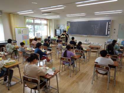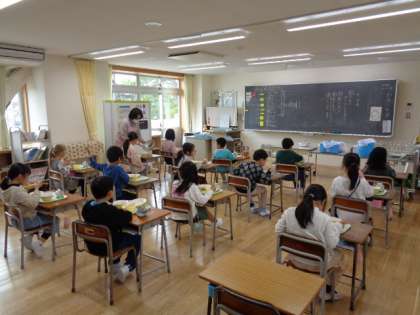 コロナ対策のため、机はそのまま全員前を向いて、静かに食べています。