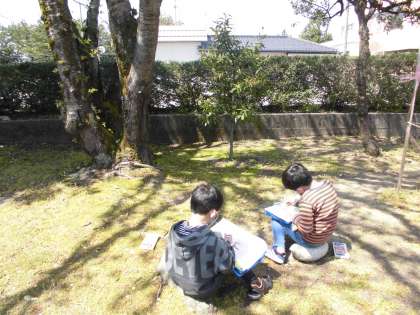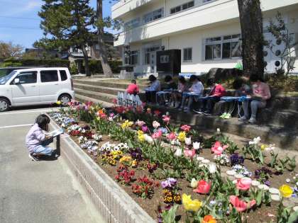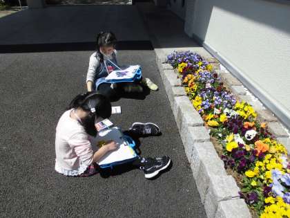 晴れて気持ちのよい天候の中、前庭や校庭に咲いている花の「おはなみ」を楽しみ、お気に入りの花を見つけてスケッチしました。