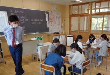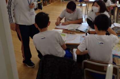 5、6年生は、社会の授業。グループで話し合いをしていました。