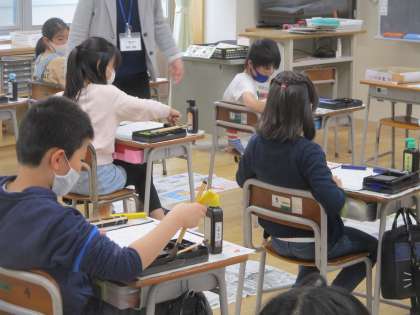 今日は4年生になって、初めて毛筆を使って字を書きました。習字セットの置き方の約束をしっかりと確認し、姿勢を正して書きます。普段の元気な様子とは違い、静かに集中して学習に取り組んでいます。