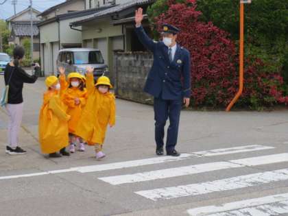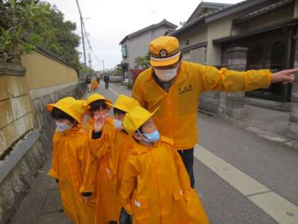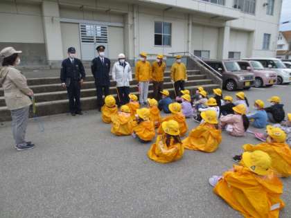 北幹部交番や浜黒崎駐在所の警察官の方々、交通安全協会の方々による交通安全教室がありました。1、2年生の子供たちは、学校周辺を歩きながら、見通しの悪いところを出るとき、横断歩道を渡るときなどに気を付けることを教わりました。