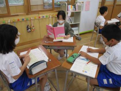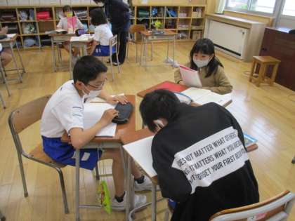 今、5年生の国語科の学習では、インタビューをしながら、「聞く」ということについて学習しています。今日は、友達の人柄が分かるように、詳しくインタビューしている様子が見られました。