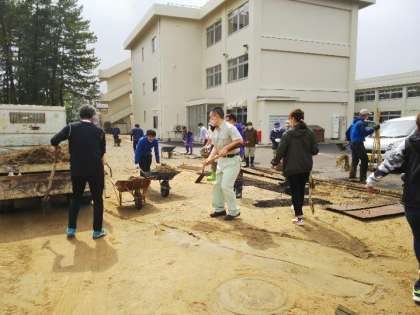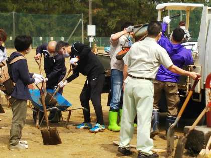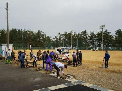 親子除草は中止となりましたが、育友会執行部の皆さんと教職員でグラウンド整備をしました。教育後援会や有為会、消防団など地域の方々も協力してくださり、業者の方には重機を出していただきました。皆様のおかげで、側溝にたまった砂を除去し、グラウンド全体の土もきれいにならすことができました。ありがとうございました。