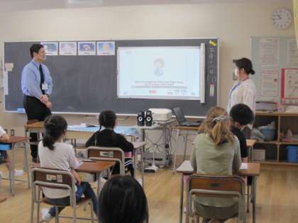 4年生は、ALT、外国語支援講師の先生方と英語の歌で学習をしていました。