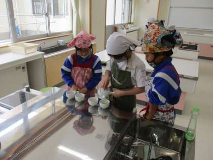 グループごとに役割分担し、準備から片付けまで協力して行いました。お茶の香りを嗅ぎ、「抹茶のにおいがする」「おいしそう」と話していました。