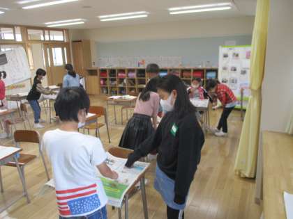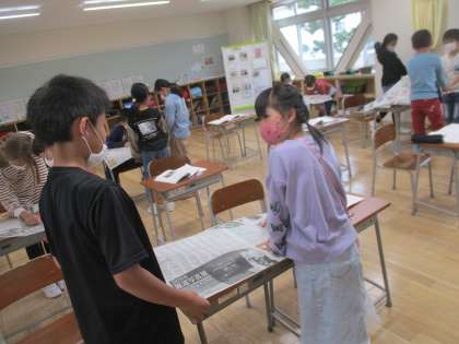 7、8段落について理解した後は、実際の新聞を使って、アップとルーズの写真を見比べました。「本当にルーズの写真もあった」「アップだと表情がよく分かるね」などと、学習したことが実際に新聞に使われていることに気付きました。