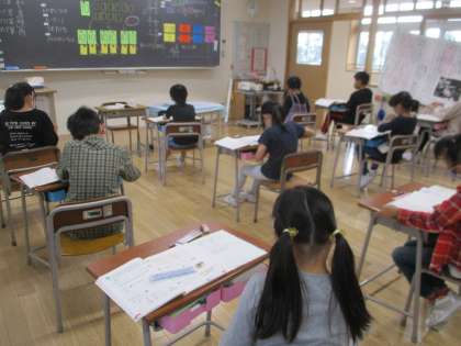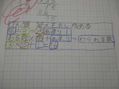 また、検算の仕方を色を付け、分かりやすくまとめています。「あまりがあっても簡単!」との声も聞こえてきました。明日は、筆算や検算がスラスラできるように練習していきます。