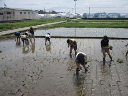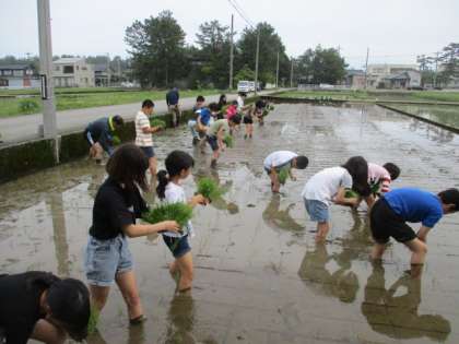 地域の方に協力していただき、学校田で田植えをしました。1つ1つの苗を手作業で丁寧に植えていきました。始めは、裸足で田んぼの中に入り「ちょっと気持ち悪い」と言っていた子供たちでしたが、だんだん作業にも慣れ、上手に植えることができるようになってきました。最後には「みんなで植えて達成感を感じた」「大変だったけど楽しかった」と話していました。今から秋の稲刈りが楽しみです。