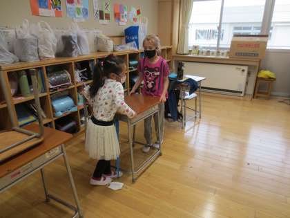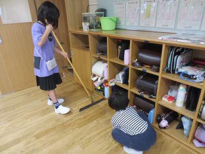 今週から縦割りグループで掃除をしています。上級生に教わりながら一生懸命に学校をきれいにしています。1年生は、今日もがんばっています。