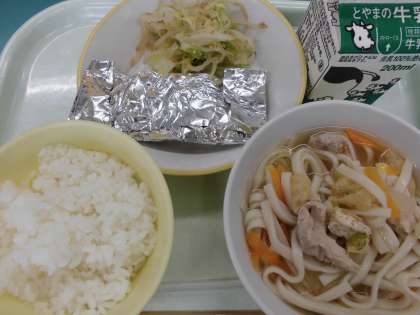 今日は、かしわうどんです。名前の通り鶏肉がのっています。きつねうどんとはまた違っておいしいです。うどんは子供たちにも人気のようで、うれしそうな声を聞きました。