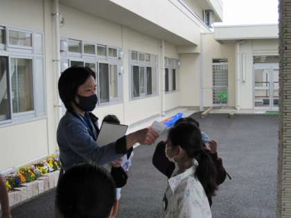 4年生は、バス乗車前に検温し、健康状態を最終チェックして、元気に出発しました。