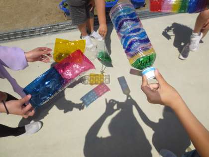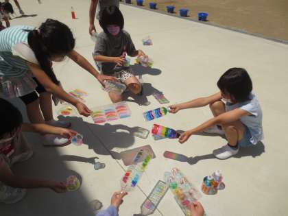 子供たちは、地面に映し出されるとってもきれいな色の「ひかりのプレゼント」を楽しみました。