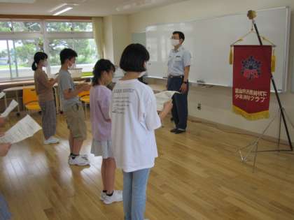 3〜4限目には、消防署員の方々が来校され、6年生を対象にBFC授与式と体験活動が行われました。BFC(Boys & Girls Fire Club)とは、少年・幼年消防クラブは、学校や家庭などにおいて防火・防災意識を高めることを目的とする自主的な防災組織のことです。