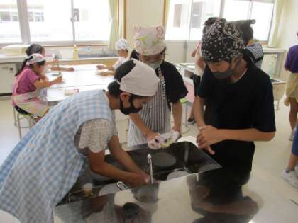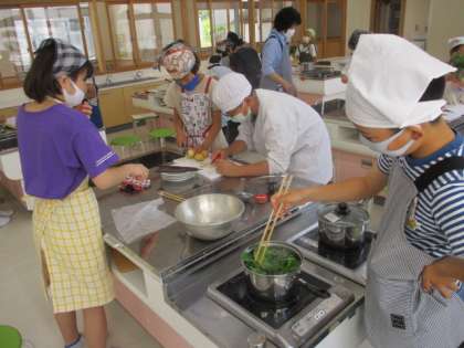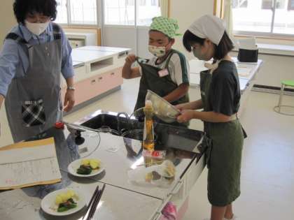 今日の調理実習はほうれん草とじゃがいもをゆでました。水からゆでる野菜と、ふっとうしたお湯からゆでる野菜があることを知った子供たちは、野菜に合わせて正しい調理方法で調理することができました。学校で包丁も初めて扱いましたが、ねこの手を意識して慎重に野菜を切っていました。今回も班で協力して活動する子供たちでした。
