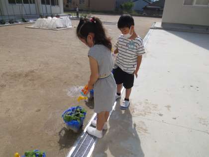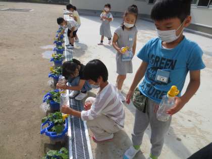 1年生は毎週月曜日にアサガオを観察しています。クロムブックで写真を撮った後は、たっぷり水をやりました。どんどん大きく生長しています。