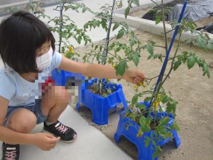 「トマトができてる!」という声の方に目を向けると、その手の先には小さなトマトがありました。