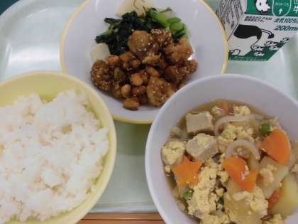 今日は、カミカミメニューでした。「大豆とホタテのゴマからめ」の大豆とホタテ、「昆布和え」の昆布が、歯ごたえがあってよく噛みました。よく噛むことで唾液がたくさん出て、歯のためにもよいので、普段からよく噛むよう意識していたらいいですね。