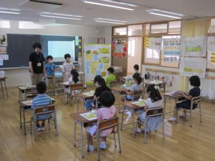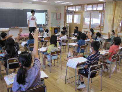 1年生は道徳の授業を始めるところ、3年生は算数の授業です。