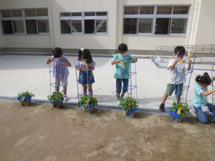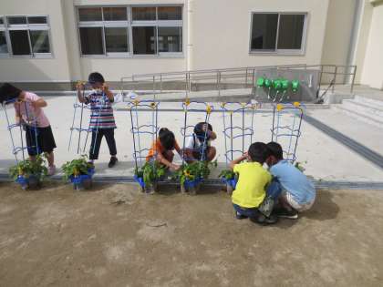アサガオのつるが伸びてきたので「棒を立てたらいい」という子供たちの意見から、支柱を立てました。どんなふうに伸びていくのか楽しみです。