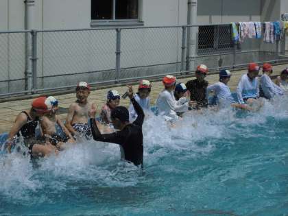 その後、プールに移動し、密を避けるため学年ごとに初泳ぎをしました。