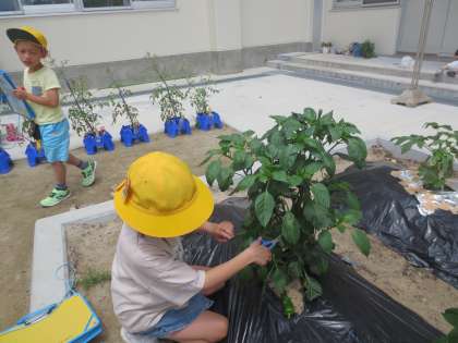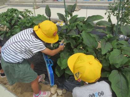 育てている野菜が実り、収穫が始まりました。丁寧に、うれしそうに収穫していました。