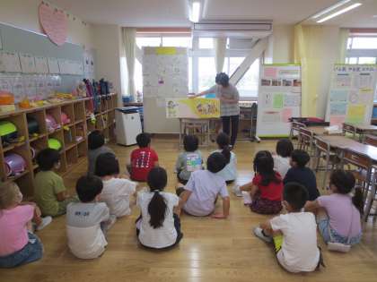 今日は、大きな絵本で読み聞かせをしていただき、わくわくしながら話を聞いていました。