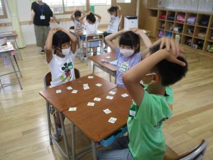 今日は「What time is it?」で、カルタゲームをしました。ALTの先生が「dream time」「lunch time」と答えたものをとっていきます。お手つきは一回休みではなく、「I’m sorry」と言い、続けることができるところも楽しいポイントです。子供たちはだんだんと、外国語に慣れ親しんできました。